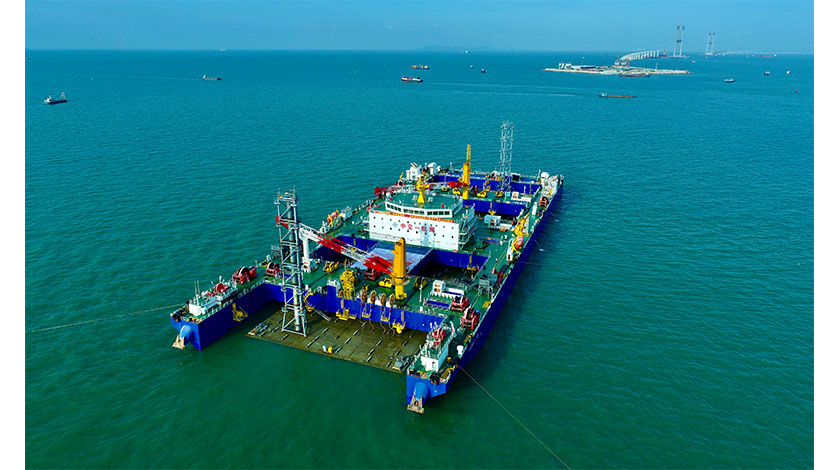 6月20日,廣東交通集團發佈消息稱,經約24.5個小時連續作業,粵港澳大灣區超級工程深中通道沉管隧道首個爬坡管節——第10個管節(E10)在深達37米的水下順利完成對接,至此項目沉管隧道已建成1608.5米。此次沉放的E10管節為標準管節,長165米,寬46米,高10.6米,重約8萬噸,是首個爬坡管節,與E9管節安裝位置同處於全隧道最低點,相當于全隧道的『落淤坑』,隧址與原礬石航道相交,形成『盤底效應』,相較于以往已沉放管節回淤強度明顯增強。圖為6月19日,E10管節正在沉放。(無人機照片)中新社發岳路建供圖