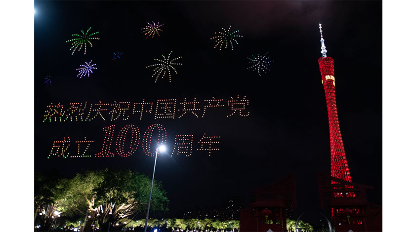 6月20日晚,以『建黨百周年暨中共三大會址紀念館開館』為主題的無人機編隊飛行表演系列活動在廣東省廣州市海心沙廣場上空舉行。圖為無人機編隊組成『熱烈慶祝中國共產黨成立100周年』的圖案。(中新社記者陳楚紅攝)
