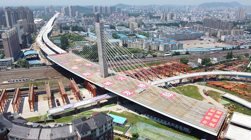 6月22日,河南省信陽市境內一座重達1.96萬噸的斜拉橋樑,在歷時74分鐘、順時針旋轉74度後成功跨越京廣鐵路信陽編組場。圖為斜拉橋樑成功跨鐵路轉體。(無人機照片)(中新社記者韓章雲攝)