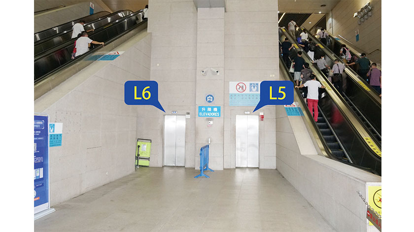 若升降機(L5)(見圖)發生故障無法使用,有需要人士可要求在場警員或保安員提供協助;必要時治安警察局將於關閘離境車道開設【臨時人工通道】以供特定人士使用。