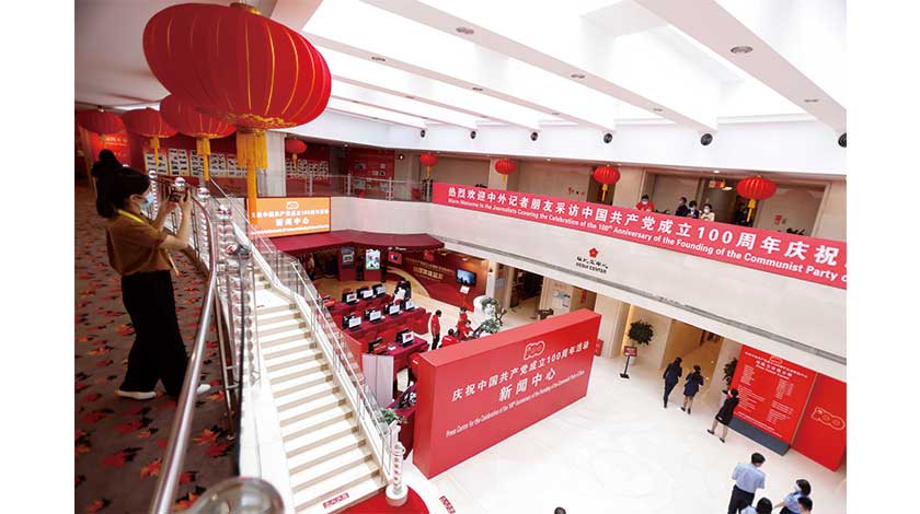 6月27日,慶祝中國共產黨成立100周年活動新聞中心在北京舉行第一場新聞發佈會,介紹新時代黨史和文獻工作。圖為慶祝中國共產黨成立100周年活動新聞中心。(中新社記者韓海丹攝)