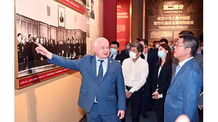 7月5日上午,俄羅斯駐華大使傑尼索夫率大使館館員等前往北京的中國共產黨歷史展覽館,參觀“‘不忘初心、牢記使命’中國共產黨歷史展覽”。中國外交部副部長樂玉成一同參觀。圖為參觀期間傑尼索夫(前左)與樂玉成交流。 中新社記者侯宇攝