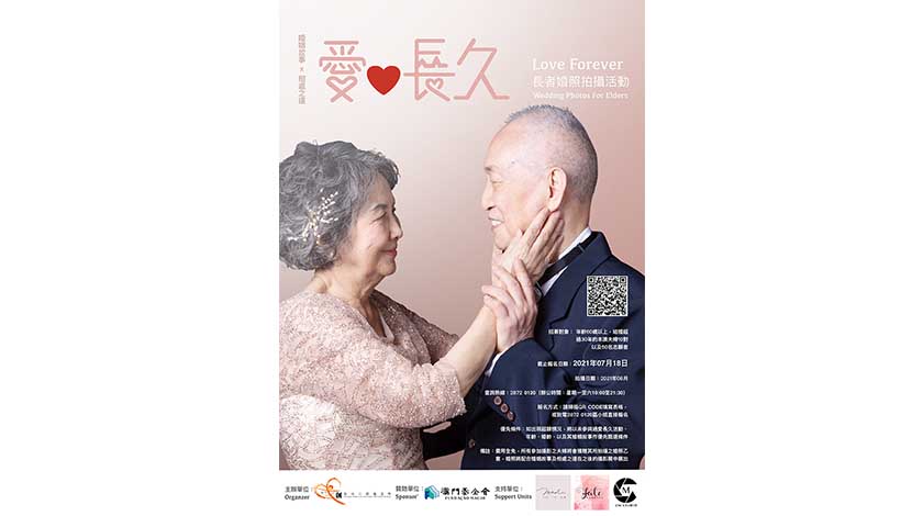 【特訊】由澳門文創藝術志願者協會主辦的「愛長久---婚照拍攝」活動現正接受報名,由即日起至2021年7月18日,凡年齡達到60歲或以上、婚齡30年或以上的長者夫婦均可參加,活動同時招募志願者,一同協助長者夫婦進行拍攝。