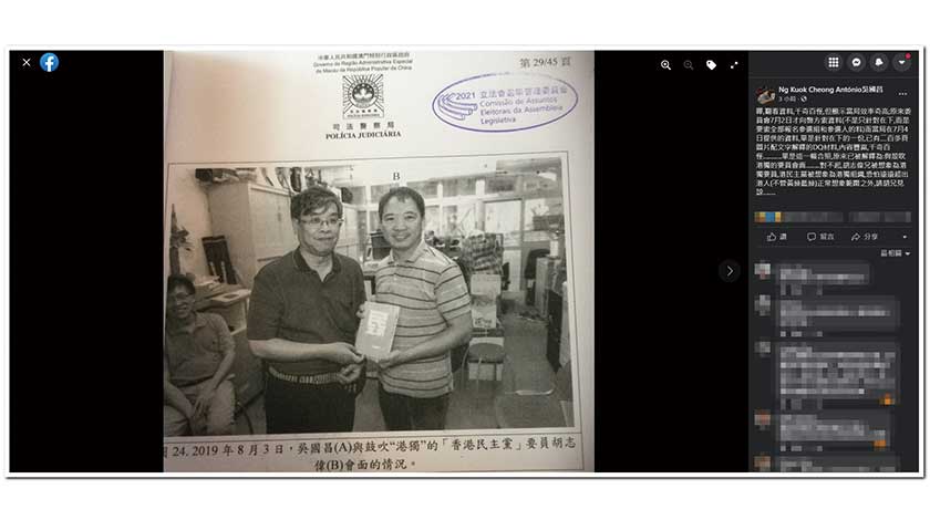 昨日,吳國昌在社交媒體公開一張圖片 (https://reurl.cc/lRl2lj),內有司法警察局的標誌、中葡文名稱,以及選管會蓋印;相信是保安司提供給選管會的資料。資料顯示一張吳國昌與胡志偉 (香港民主黨) 的合照,並附上文字:「吳國昌與鼓吹『港獨』的『香港民主黨』要員胡志偉會面的情況。」