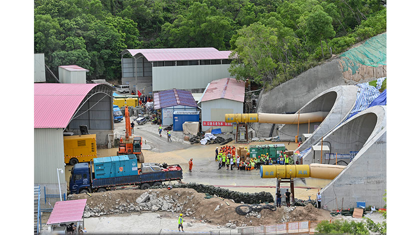 16日,廣東省珠海市,石景山隧道入口。當日,珠海市人民政府新聞辦公室召開新聞發佈會,針對興業快線(南段)項目石景山隧道施工段透水事故救援情況進行第二次通報。據悉,截至7月16日12時,救援作業面已向隧道內推進395.3米,距離受困點764.5米,隧道內水位持續下降。目前被困人員仍然無法聯系。(中新社記者陳驥旻攝)