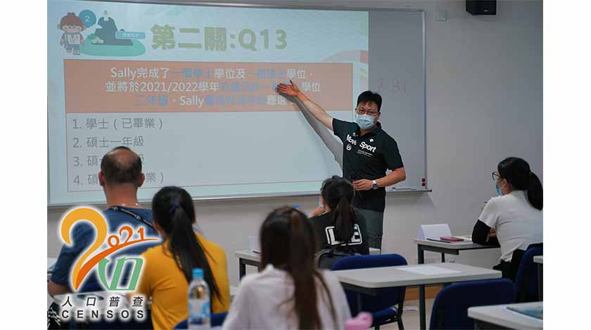 為確保培訓工作順利完成,統計局派出50位導師,合共72班為約2600名學員進行普查員課堂培訓。内容包括理論與實踐兩個方面,導師會教授普查員各樣專業知識及技能,包括問卷內容、住戶訪問技巧、特別情況的應變方法,以及設備操作等。此外,人口普查熱線操作員及組長須接受額外的相關培訓。培訓學員的網上學習成績及課堂培訓期間的表現將作為整體評核的依據,合格的學員才被錄取參與8月的人口普查資料收集工作。