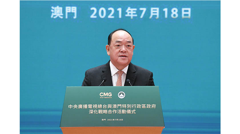 中央廣電總台與特區深化戰略合作活動儀式昨在澳舉行,行政長官賀一誠、中共中央宣傳部副部長兼中央廣電總台台長慎海雄、中聯辦主任傅自應、外交公署特派員劉顯法、駐澳部隊司令員徐良才與社會文化司司長歐陽瑜等出席主禮。