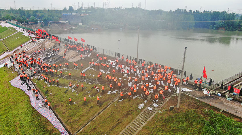 7月22日,航拍五星水庫搶險現場。受連日來強降雨影響,位於河南省新密市的五星水庫7月21日出現重大險情,堤壩後側發生三處坍塌,出現了明顯裂縫。22日,武警官兵和當地民眾奮戰在大堤一線,填充沙袋,加固堤壩。截至當日下午,五星水庫三處坍塌均已加固完畢,險情基本解除。(無人機照片)中新社發王靖驍攝