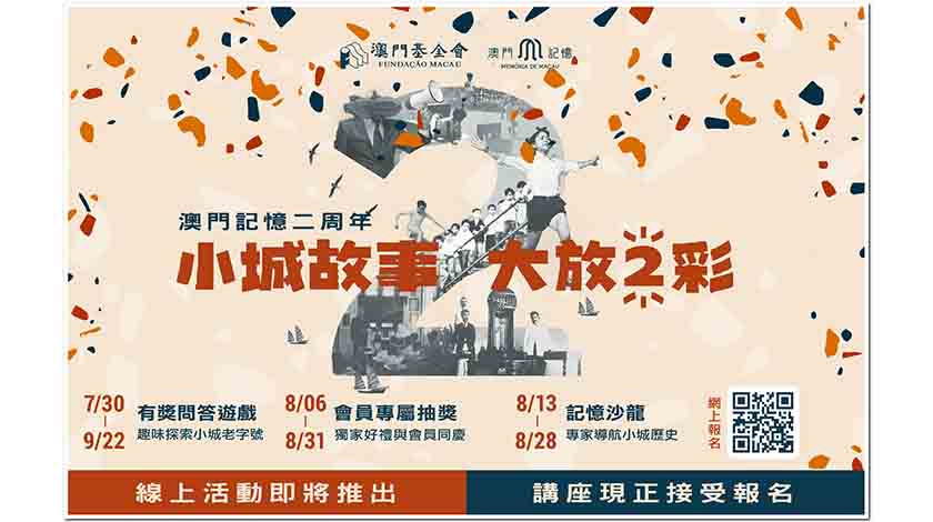 【特訊】為慶祝“澳門記憶”文史網(www.MacauMemory.mo)開站兩周年,“澳門記憶”即日起至9月22日期間推出“小城故事 大放‘2’彩”系列活動,透過線上線下並行的活動巡禮,進一步加強與公眾的聯繫和互動,並吸引更多領域的人士關注、參與及傳承小城歷史文化。