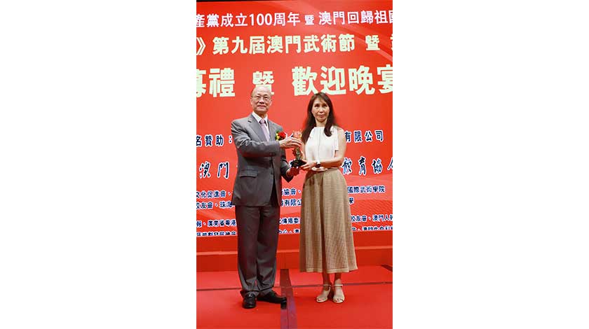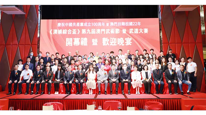 2021「澳娛綜合盃」開幕儀式暨歡迎晚宴27日晚假新葡京宴會廳舉行,中聯辦宣傳文化部部長萬速成、社保基金行政管理委員會主席容光亮、澳區全國人大代表劉藝良、立法議員梁安琪、澳門基金會行政委員會委員黎振強、旅遊局旅遊產品處處長史濠、澳門武術總會理事長陳永傑、工聯體委會主任阮愛武、澳娛綜合董事局主席何超鳳、「澳娛綜合盃」第九屆澳門武術節暨武道大賽大會主席、澳門中華民族傳統體育協會會長蘇樹輝等出席及主禮。歡迎晚宴上,大會舉行了裁判代表及運動員代表宣誓,席間亦上演了武術套路表演及競技展示。