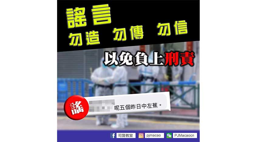 司警局在此呼籲,在突發公共事件下,尤其即時預防或更高級別的狀態維持期間,意圖引起公眾受驚或不安,編造並傳播有關的虛假資訊,行為人需負刑事責任,嚴重更可處最高三年徒刑。同時,呼籲市民應密切留意官方訊息,切勿輕信謠言。
