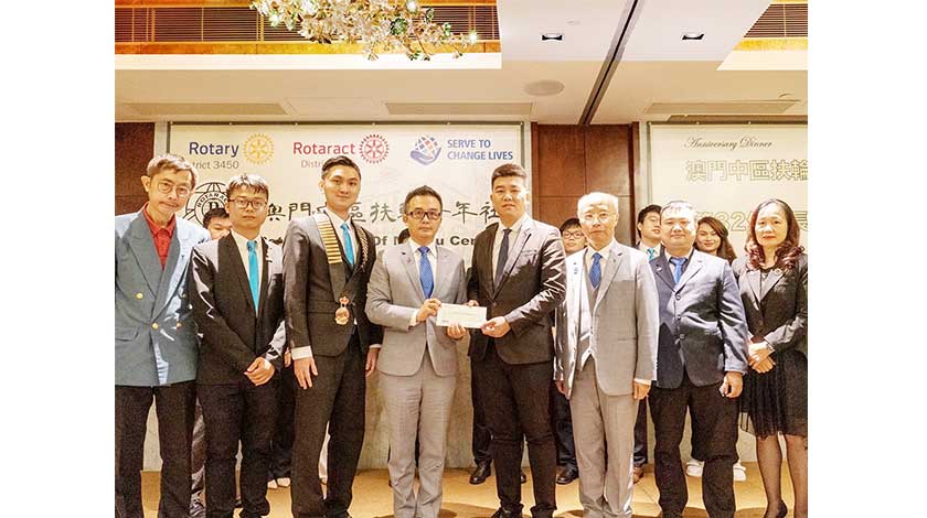 同時,澳門中區扶輪社因應河南省早前暴雨水災,聯同扶青社向中聯辦送上捐款支票,在一眾嘉賓以及前社長李銹儀、黃偉傑的見證下,由社長周勝轉交支票予中聯辦代表梁錚。