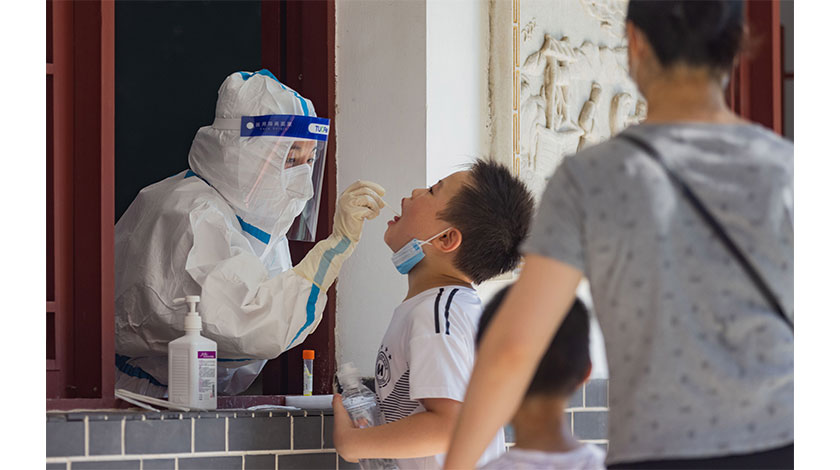 8月8日,在南京城南一處核酸檢測點內,醫務人員為一名孩子進行核酸檢測。當日,南京市啟動第六輪部分區域大範圍核酸檢測。(中新社記者泱波攝)