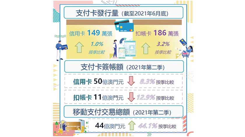 由澳門銀行核發的個人信用卡總數於2021年6月底為1490781張,與上季比較上升1.0%,按年比較增長2.1%。澳門銀行核發的扣帳卡總數達1857440張,與上季比較上升3.2%,按年比較亦增加10.3%。