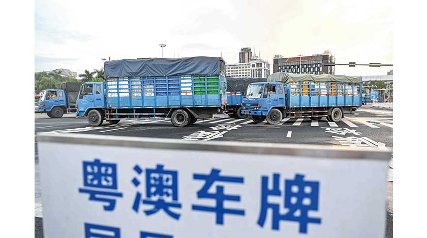 8月16日,廣東省珠海市拱北口岸,供澳(門)鮮活產品車輛排隊進入拱北口岸。目前,經珠澳口岸出入境人員(包括珠澳跨境貨車司機)需持有48小時內核酸檢測陰性證明通關,拱北口岸日均驗放各類供澳(門)鮮活產品車輛約120輛次。(中新社記者陳驥旻攝)
