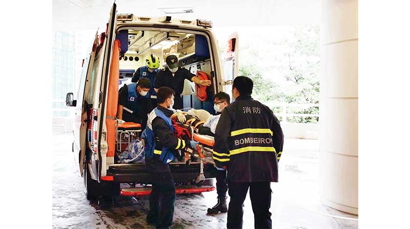 昨日上午九時許,消防接報氹仔新城大馬路銀河渡假村第三期地盤發生嚴重工業意外,救護員到場見一名男性傷者背部大量出血,身體多處骨折,情況嚴重,立即將他送往山頂醫院搶救,消防局通知勞工局和警方跟進事件。傷者經醫護急救後,於上午十時証實不治死亡。