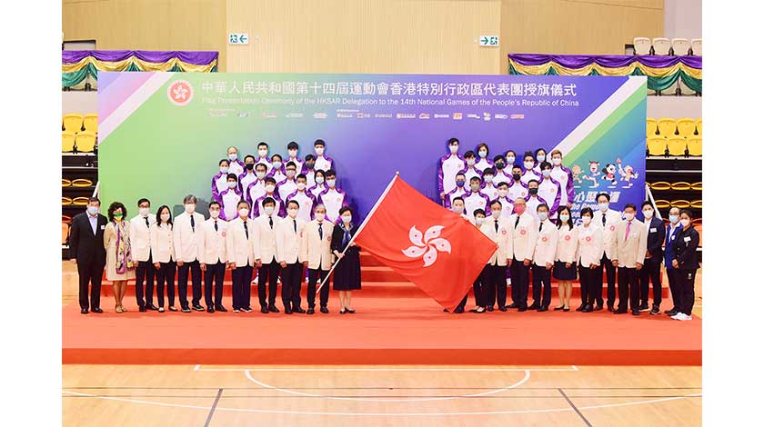 中華人民共和國第十四屆運動會(全運會)香港特別行政區代表團授旗儀式20日在荃灣體育館舉行,行政長官林鄭月娥主持授旗儀式。第十四屆全運會將於9月15日至27日在陝西舉行,香港特區將會派出237人的代表團,當中包括171名運動員參加18個決賽項目,及66名隨隊工作人員。(香港中通社)