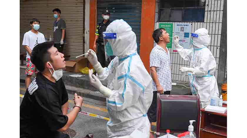 8月22日,中南大學湘雅醫院的醫務人員為居民進行核酸檢測。當日,湖南省張家界市永定區啟動街道第11輪全員核酸檢測。中新社