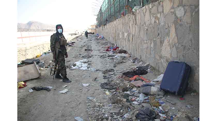 27日,一名阿富汗塔利班人員站在喀布爾機場附近的爆炸現場。