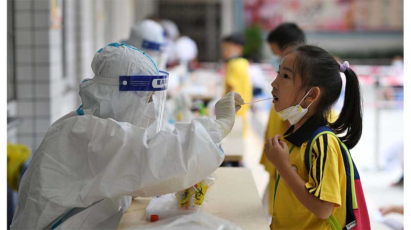 8月28日,學生在廣東省廣州市越秀區育才學校做核酸檢測。為進一步做好中小學、幼兒園秋季學期開學新冠肺炎疫情防控工作。中新社