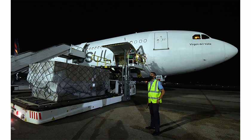 8月28日,工作人員在古巴哈瓦那機場卸載中國政府緊急援助的抗疫物資。這批援助物資包括抗原檢測試劑、防護手套、防護服和護目鏡等。 新華社發