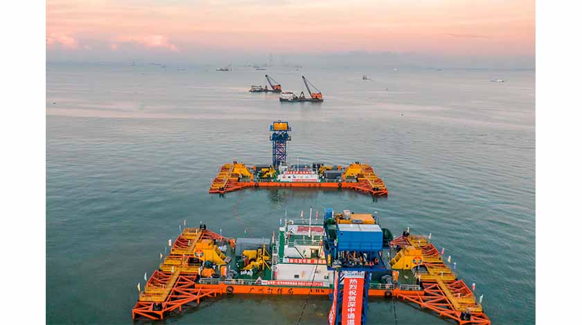 8月30日,歷經38小時連續施工作業,粵港澳大灣區超級工程——深中通道沉管隧道東端首個管節E32完成沉放安裝。廣東省交通集團稱,從今年9月開始,深中通道正式開啟東西兩側同步安裝沉管的新征程,預計2023年,項目東、西人工島將通過沉管隧道跨越伶仃洋“牽手”。深中通道是集“橋、島、隧、水下互通”於一體的超級跨海集群工程,其中海底隧道長約6.8公里(沉管段長約5公里),採用國內首次應用、國際首次大規模應用的鋼殼混凝土組合結構形式,由32個管節和1個最終接頭組成,是目前世界上最寬的海底沉管隧道。圖為工程現場。中新社