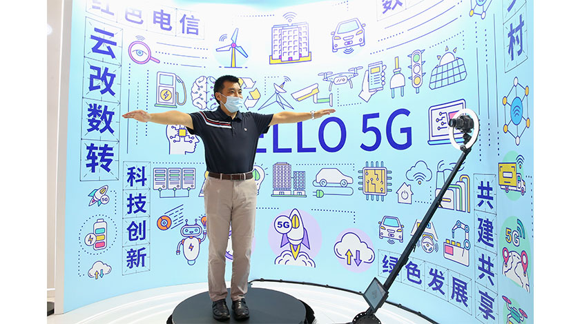 9月1日,北京亦創國際會展中心,世界5G大會展覽向民眾開放。圖為參觀者在中國電信展區體驗5G立體影像拍攝。中新社