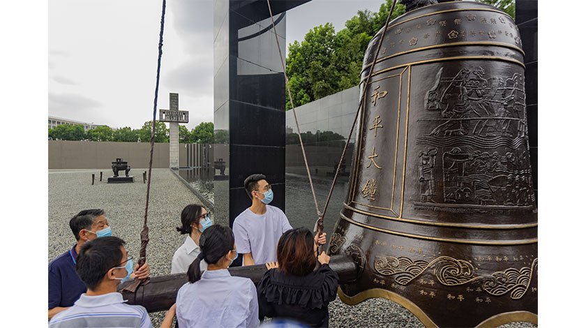 9月3日,位於江蘇省南京市的侵華日軍南京大屠殺遇難同胞紀念館舉行撞響和平大鐘儀式。南京大屠殺幸存者後代、師生代表、媒體代表等12人參加撞鍾儀式,大鐘撞響13聲,紀念中國人民抗日戰爭暨世界反法西斯戰爭勝利76周年。中新社