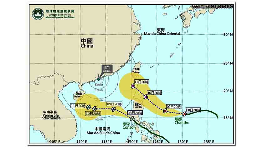 氣象局昨日下午發特別信息,指熱帶氣旋「康森」將於今日(周四)下午至晚間進入本澳八百公里範圍,大致趨向海南島一帶,屆時會發出熱帶氣旋信號。與其相關的雨帶將於明日(周五)後期起為本澳帶來驟雨。