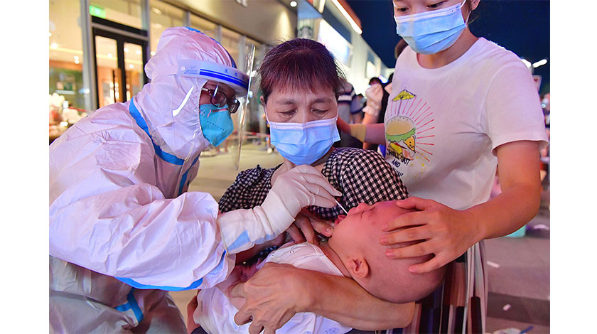 9月12日晚,福建省仙游縣,醫務人員正在為一位幼兒進行咽拭子採樣。中新社