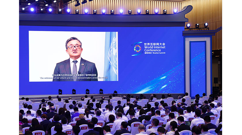 26日,2021年世界互聯網大會烏鎮峰會在浙江省桐鄉市烏鎮開幕,主題為『邁向數字文明新時代——攜手構建網絡空間命運共同體』,由國家互聯網資訊辦公室和浙江省人民政府共同主辦。圖為聯合國副秘書長劉振民以視頻方式發表演講。中新社記