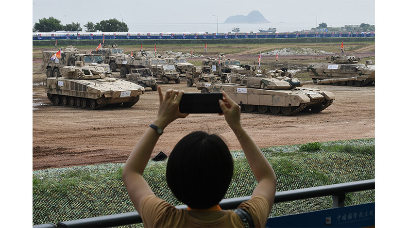 9月29日,地面裝備在廣東珠海國際航展中心進行動態演示,吸引參觀者拍照。當日,第十三屆中國航展進入第二個專業觀眾日。中新社