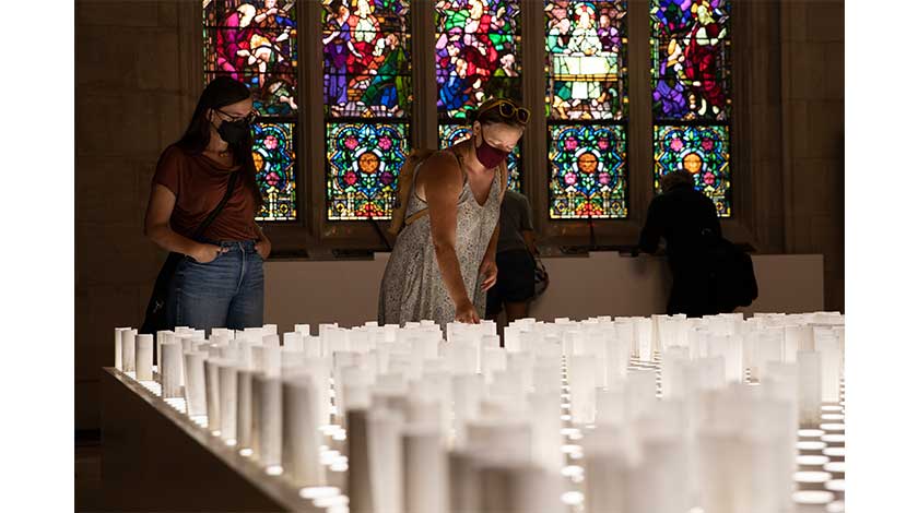 當地時間10月7日,美國紐約綠林墓地教堂內陳設由藝術家創製的互動藝術裝置“終結之後”(AftertheEnd)。作品由上百支寫有寄語的紙筒組成發光祭壇,參觀者可在現場書寫寄語放入祭壇,表達對新冠逝者的悼念。中新社