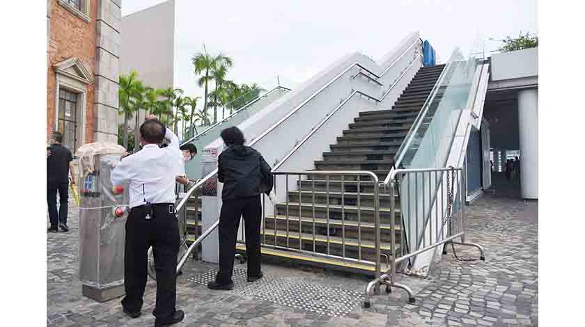 強烈熱帶風暴“圓規”迫近香港帶來強勁風勢,天文台10月12日傍晚發出八號烈風或暴風信號。這是繼熱帶風暴“獅子山”後,香港相隔3天再掛“八號風球”,為有紀錄以來首次4天內兩度掛“八號”。圖為尖沙咀海濱工作人員封鎖觀景台樓梯。(香港中通社)