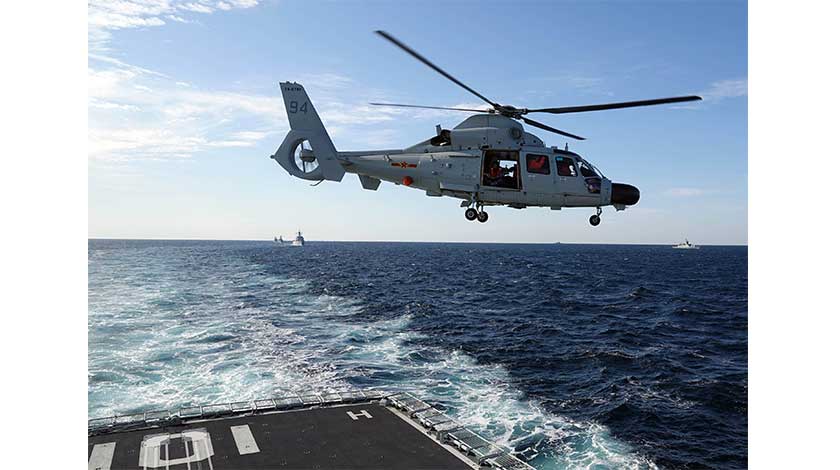 10月15日,中俄“海上聯合-2021”聯合軍事演習進入第二天,在俄羅斯彼得大帝灣附近海域進行實兵演練。圖為中方指揮艦南昌艦艦載直升機飛行演練。中新社