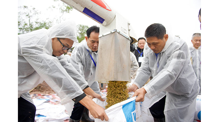 17日,工作人員封裝收割的稻谷。當日,在湖南省衡南縣向陽橋街道清竹村梓木沖基地,2021年南方稻區雙季畝產1500公斤攻關示範測產驗收,測得晚稻平均畝產為936.1公斤。加上該基地7月測產的早稻畝產667.8公斤,周年畝產稻谷1603.9公斤。這是目前為止,南方稻區雙季取得的最高畝產。中新社