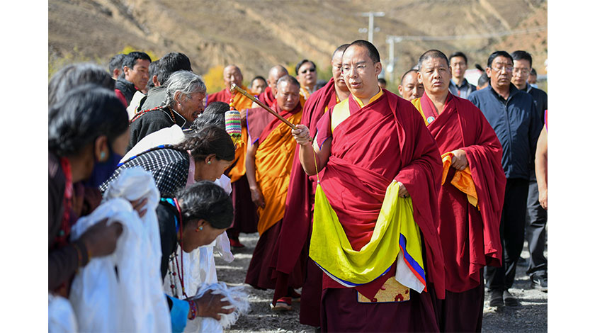 10月,全國政協常委、中國佛教協會副會長、中國佛協西藏分會會長班禪額爾德尼•確吉傑布在日喀則開展佛事和社會活動,並勉勵僧尼珍惜和維護藏傳佛教領域穩定團結大局,與社會的進步、國家的繁榮同頻共振。圖為10月17日,班禪到日喀則桑珠孜區塔傑珠德寺禮佛、講經,並為聞訊而來的信眾摸頂賜福。中新社