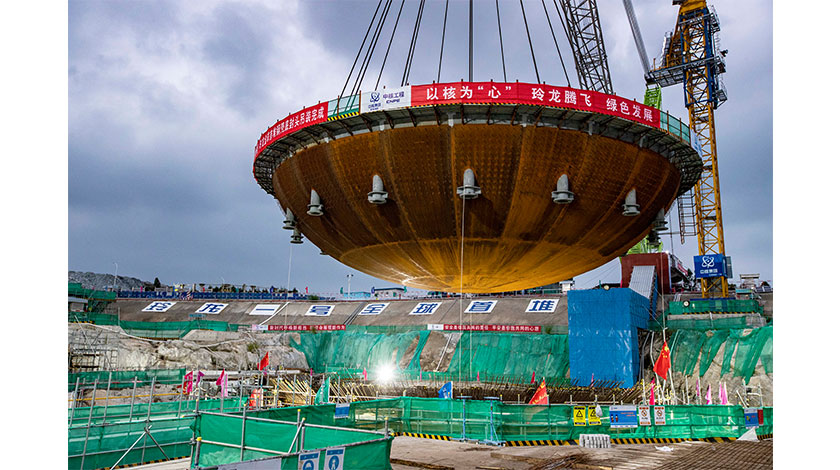 10月24日,全球首個陸上商用模塊化小堆玲龍一號鋼製安全殼底封頭在海南昌江提前吊裝完成。這是海南昌江多用途模塊式小型堆科技示範工程建設的重要里程碑,為後續反應堆廠房主體結構施工奠定堅實基礎。圖為吊裝現場。中新社