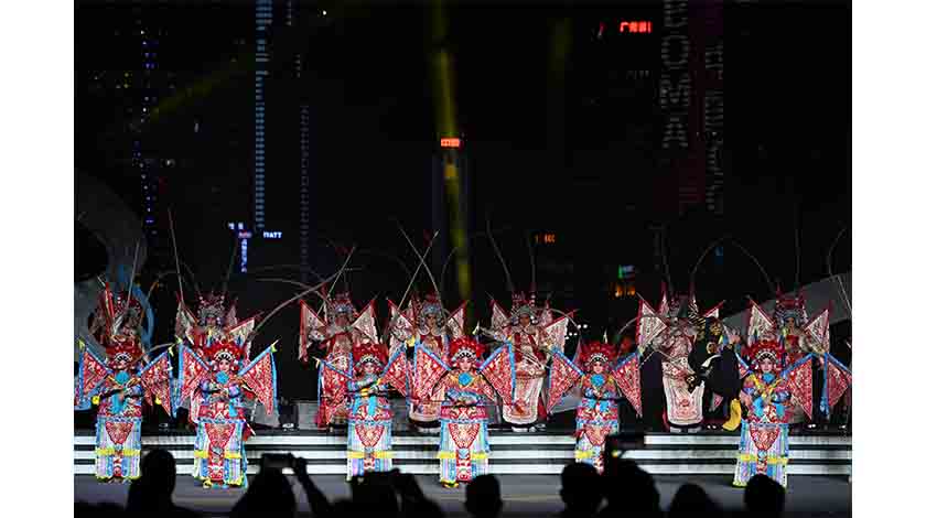 10月24日晚,廣東省廣州市,“粵韵飛揚 樂美灣區”——粵港澳大灣區(廣州)文化周系列活動開幕文藝演出在廣州塔舉行。圖為粵歌《南國紅豆競芳菲》。