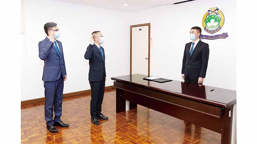 【特訊】懲教管理局於昨日舉行新任主管人員就職儀式,由程况明局長監誓,並在趙崇遠副局長和各部門主管見證下,路環監獄獄長林錦秀、保安及看守處處長劉遠程宣誓就任。