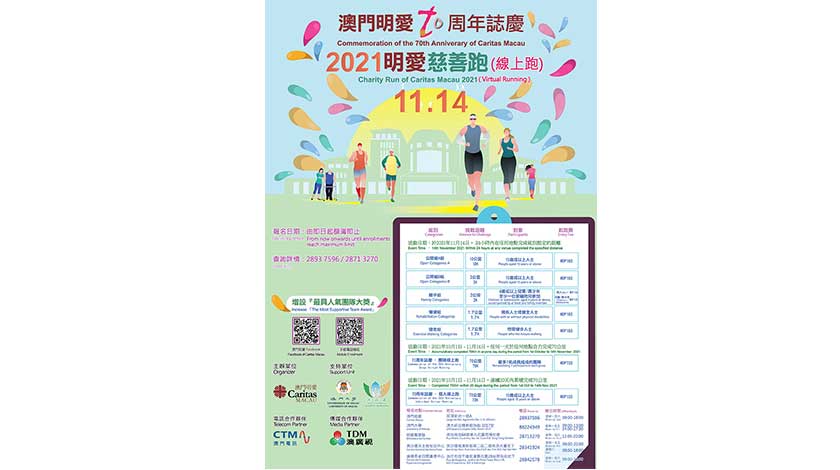 【特訊】澳門明愛70周年誌慶-2021明愛慈善跑原定於本年10月17日舉行的線上跑,基於新型冠狀病毒肺炎疫情的發展,已延期至本年11月14日舉行。