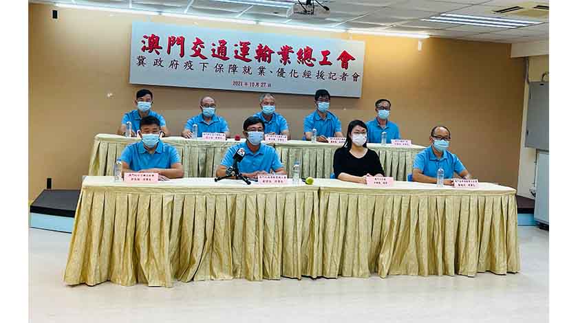澳門交通運輸業總工會昨舉行《冀政府疫下保障就業 優化經援》新聞發布會,邀請立法議員李靜儀、澳門交通運輸業總工會理事長劉偉強、澳門的士司機互助會理事長郭良順、澳門貨車運輸業互助會理事長鄺熾明、澳門教車業職工會理事長鄭北贊、澳門博彩業司機職工會理事長梁日強、澳門重型車司機職工會理事長蔡文陽、澳門三輪車工會理事長何華福、澳門旅遊業司機總會副理事長盧銳霆等出席,反映多個工種職業司機的就業狀況。