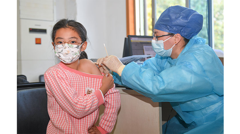 浙江省杭州市的一名小學生接種新冠疫苗。近日,杭州啟動3-11歲人群新冠病毒疫苗接種工作。中新社