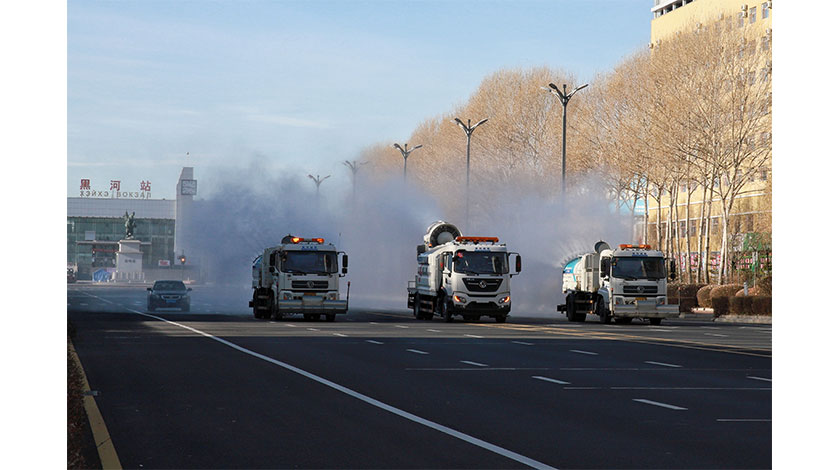 11月2日,黑龍江省黑河市,消殺車輛在街道進行消殺工作。中新社