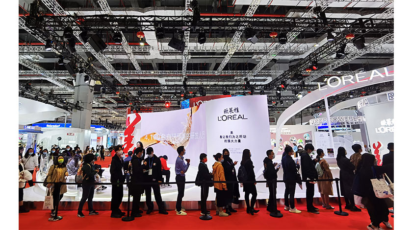 11月10日,在國家會展中心(上海)舉行的第四屆中國國際進口博覽會閉幕。受疫情等因素影響,本屆進博會按一年計意向成交金額707.2億美元,比上屆略降2.6%。圖為參觀者排隊參觀展臺。中新社