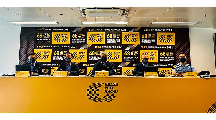 第六十八屆澳門格蘭披治大賽車將於本月十九至廿一日舉行共六項賽事;體育局、交通事務局、治安警、大賽車基建專責小組昨舉行了大賽車交通安排發布會,由體育局局長潘永權、大賽車基建專責小組組長杜文堅、交通事務局副局長羅誠智、交通事務局協調處處長莫垂道、治安警交通廳警司梁華志介紹交通安排。