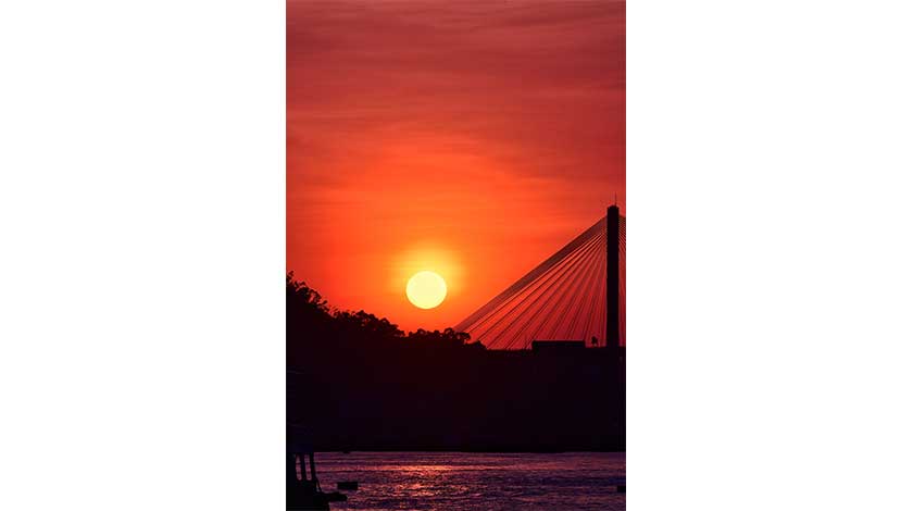 香港不少市民前往荃灣海濱公園,觀看汀九橋日落。每年秋季,夕陽會與荃灣海濱公園以西的汀九橋重合,形成亮麗風景。(香港中通社記者 許其皓攝) 香港中通社圖片