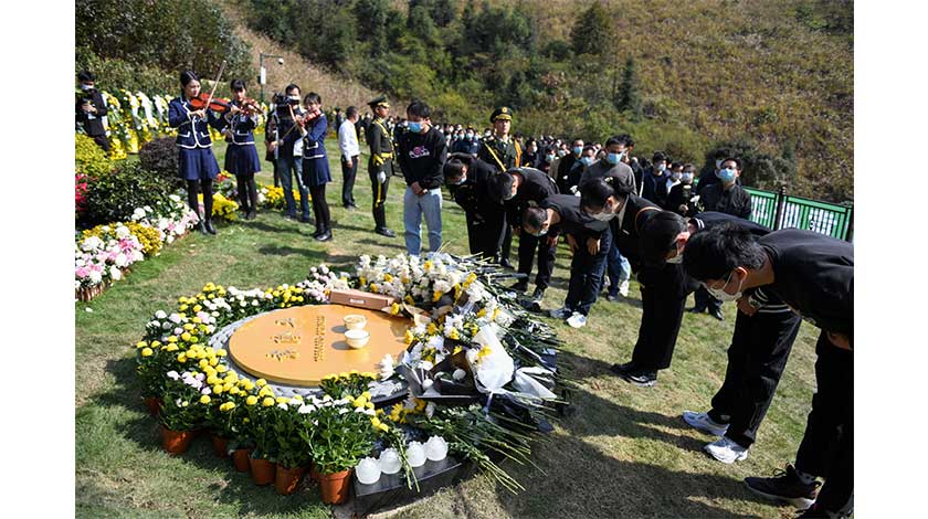11月15日,“共和國勛章”獲得者、中國工程院院士袁隆平靈骨安放儀式在長沙市唐人萬壽園陵墓舉行。今年5月22日,“雜交水稻之父”袁隆平在長沙逝世,享年91歲。圖為民眾向袁隆平院士墓地鞠躬。(中新社)