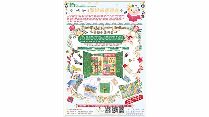 由12月1日開拆,每天為你送上一份窩心小禮物及專屬小祝福,共24項,包括多款自家製產品、特式食品、防疫物資、生活用品、聖誕主題禮品及文具,現金代用券等,還包括全新未開售的新產品;再者精美的禮物盒最後更能成為萬用收納盒,每樣禮品都十分實用!只需MOP$388,體驗價值MOP$559的快樂,禮盒的80%收入將撥作服務使用者津貼,其餘20%將納入職業培訓新項目經費。一同為殘疾人士出一份力,亦在這感恩的佳節為身邊的人送上一份愛與關懷吧。