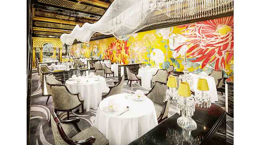 「御花園」餐廳入口的雕花閘門的氣派巍然,繁花綠葉簇擁的接待處一邊連接貫徹宮廷園林主題的包廂,另一邊通往主用餐區及其他設施,展開別有天地的尋味之旅。主用餐區考究奢華,長達35米的特製蘇州絲繡貫穿整個大廳,細膩描繪菊花簇擁的美艷。相對的六幅雙面蘇繡團扇屏風上,靈巧雀鳥與群花圖案栩栩如生,映襯走廊的《紅樓夢》大觀園情景,鉅細無遺地將故事人物的一顰一笑刻劃在金碧輝煌的鏡牆上。